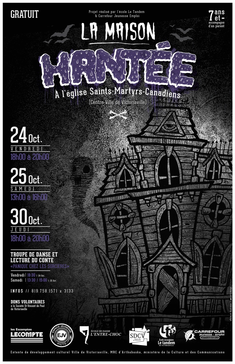 En prévision de l’Halloween, l’Espace jeunesse Victo invite les plus braves à visiter la maison hantée aménagée dans l’église Saints-Martyrs-Canadiens! Organisé en partenariat avec la SDC centre-ville de Victoriaville, le Carrefour Jeunesse-Emploi Arthabaska et l’école secondaire Le Tandem, ce rendez-vous permettra aux plus téméraires de vivre une belle activité d’Halloween.