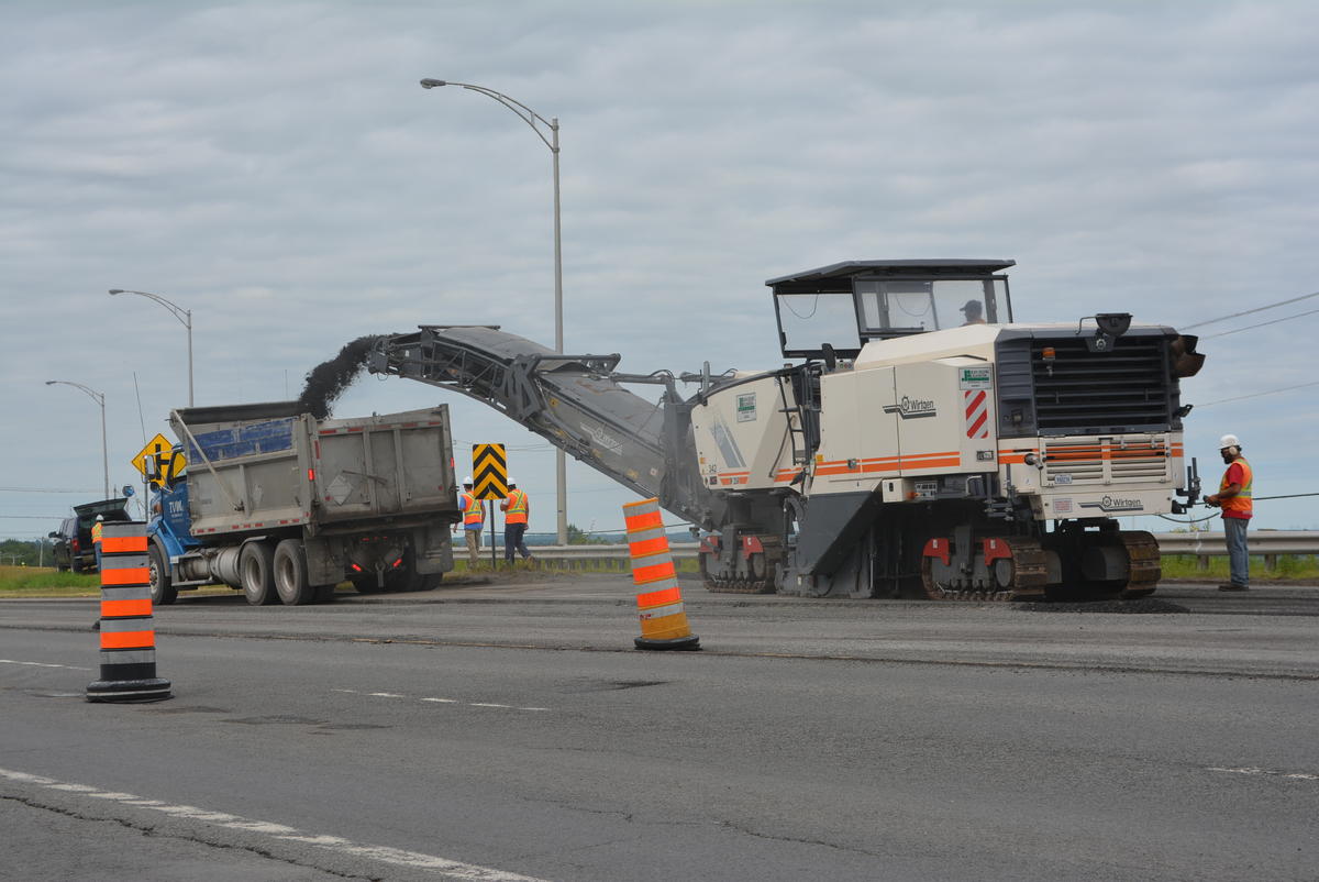 L’opération, qui permet de conserver le fonds de route, consiste à enlever par rabotage le revêtement bitumineux de la chaussée existante de 70 mm afin d’y corriger certains défauts de surface et de procéder au renforcement de la structure avant l’application d’un nouveau revêtement bitumineux de 100 mm.