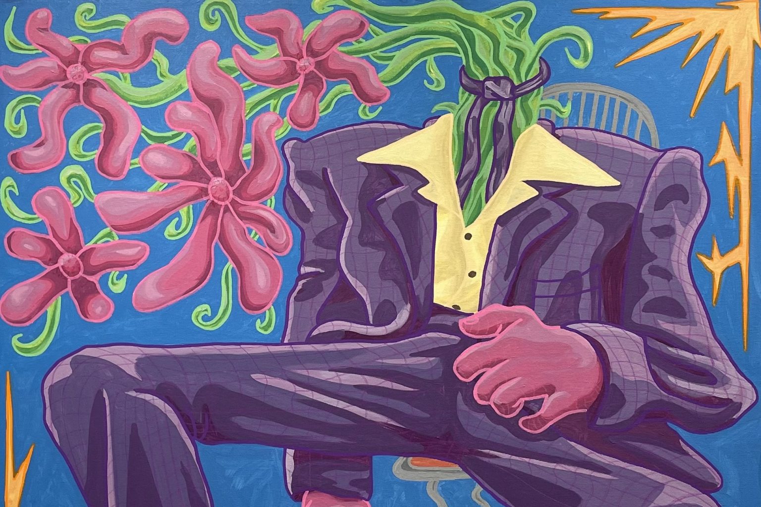 Même chose pour Velvet dont on a toutefois pu découvrir le travail dans différents endroits de la région. En effet, s’il présente majoritairement des peintures à l’exposition, il œuvre toutefois dans l’animation, l’illustration et la sérigraphie. D’ailleurs, il s’exprime beaucoup par ce dernier médium, souvent imprimé sur des chandails recyclés ou autres supports, ce qui vient bien représenter ses valeurs (slow fashion).