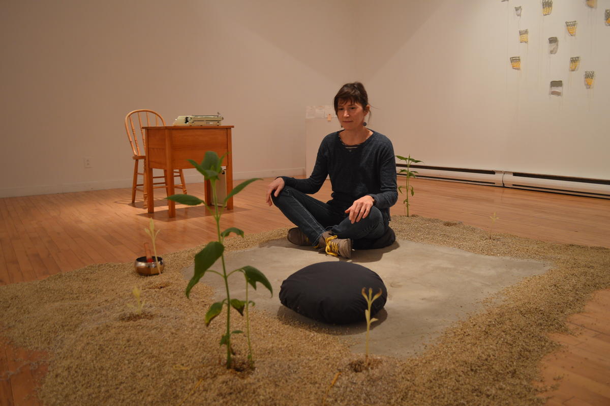 Dans cet autre espace, elle a coulé une dalle de béton en centre. Deux coussins y sont posés et, de chaque côté, des tiges de topinambour sont plantées. Sur les deux murs latéraux, elle a installé 68 carrés crochetés trempés à moitié dans le béton. Le visiteur sera invité à défaire un carré, en tirant le fil et l’amener à rejoindre une des plantes. Ensuite, il pourra s’asseoir au centre et méditer. Finalement, le visiteur pourra prendre un petit sac qui contient une pomme de terre et s’engager dans une «correspondance jardinière» avec l’artiste. Ou bien il choisira de prendre place sur le petit bureau et taper à la machine sa correspondance.