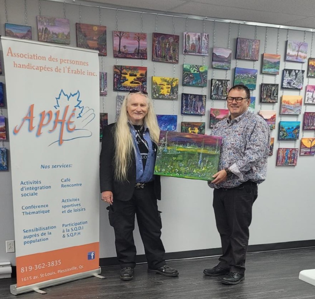 En plus d’être impliqué à l’APHÉ depuis 2020, Marcel Houde se dévoue auprès de Droits Devant Érable et des Chevaliers de Colomb. Il est très actif aussi auprès de l’Atelier galerie d’art de Victoriaville où il expose quelques-unes de ses oeuvres. Il se spécialise dans le paysage très coloré en technique mixte, acrylique ou huile.