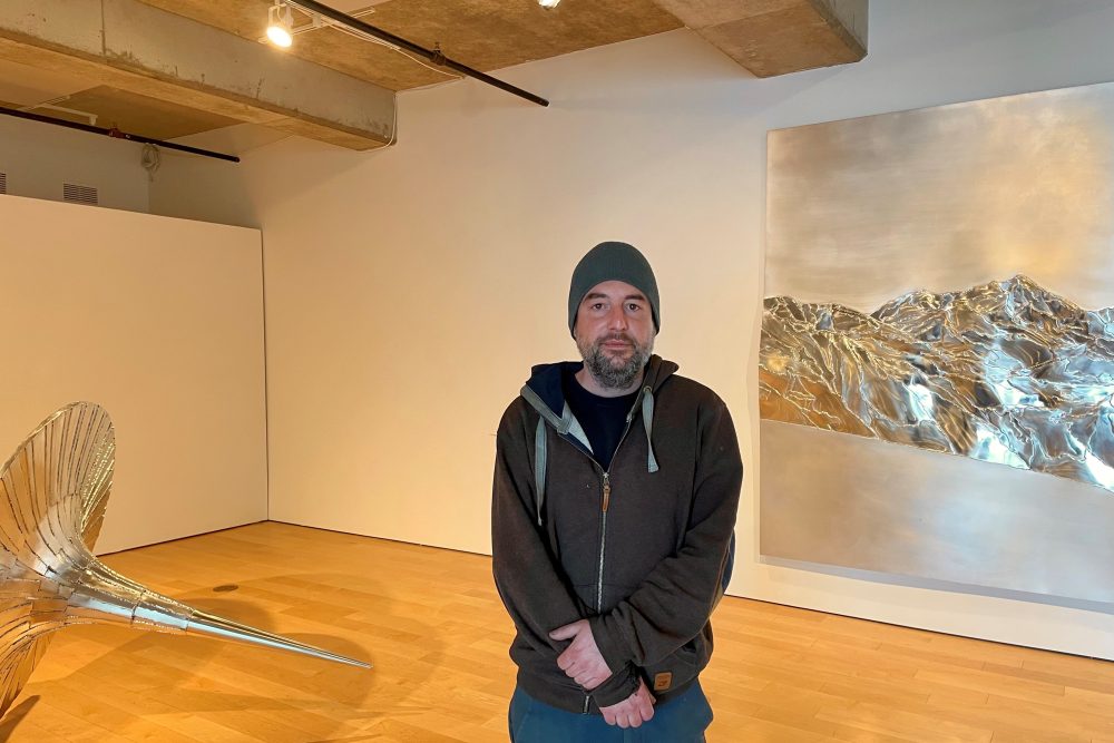 Habituellement plus actif dans le domaine de l’art public, Marc-Antoine Côté cumule une dizaine d’expositions en solo. Les Grands Espaces regroupe sept de ses sculptures formées d’acier inoxydable et d’aluminium. “La sculpture à l’entrée, cette boule un peu difforme, est la pièce maitresse de ce que j’ai voulu démontrer dans mon exposition. C’est avec elle que je me suis fait connaître. Je l’ai fait en 2014 et c’est un travail très aléatoire, c’est comme avoir dessiné librement dans l’espace. Ensuite, il y a une autre œuvre d’exposée avant d’entrer dans la salle, c’est celle-ci qui m’a donné envie de voyager. Comme mon frère habite en Suisse, c’est là que je suis allé et ça m’a donné de l’inspiration pour Les Grands Espaces“, a expliqué Marc-Antoine Côté.