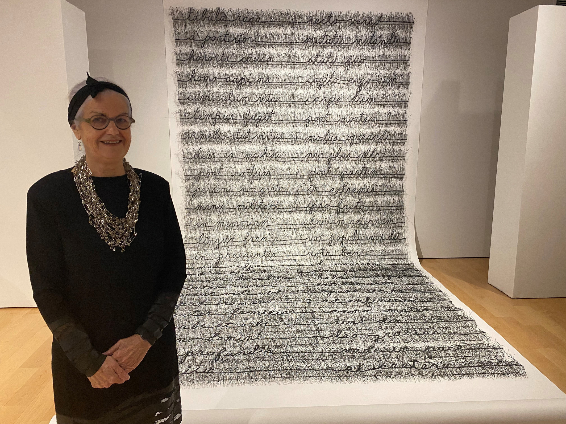 La pièce de résistance, intitulée “J’en perds mon latin”, impressionne alors qu’elle démontre l’intérêt de l’artiste pour la langue, française en particulier. “Comme j’habite Montréal, je suis inquiétée par le glissement vers l’anglais”, confie-t-elle. Le souci de la langue demeure pour elle avec l’œuvre, elle rappelle les origines latines du français. La sculpture rappelle des expressions latines, toujours fréquemment utilisées. Un grillage d’acier, sur lequel la locution a été tracée, a ensuite été découpé. On retrouve encore le long travail répétitif, méditatif à la limite, mais qui donne un résultat imposant et impressionnant.