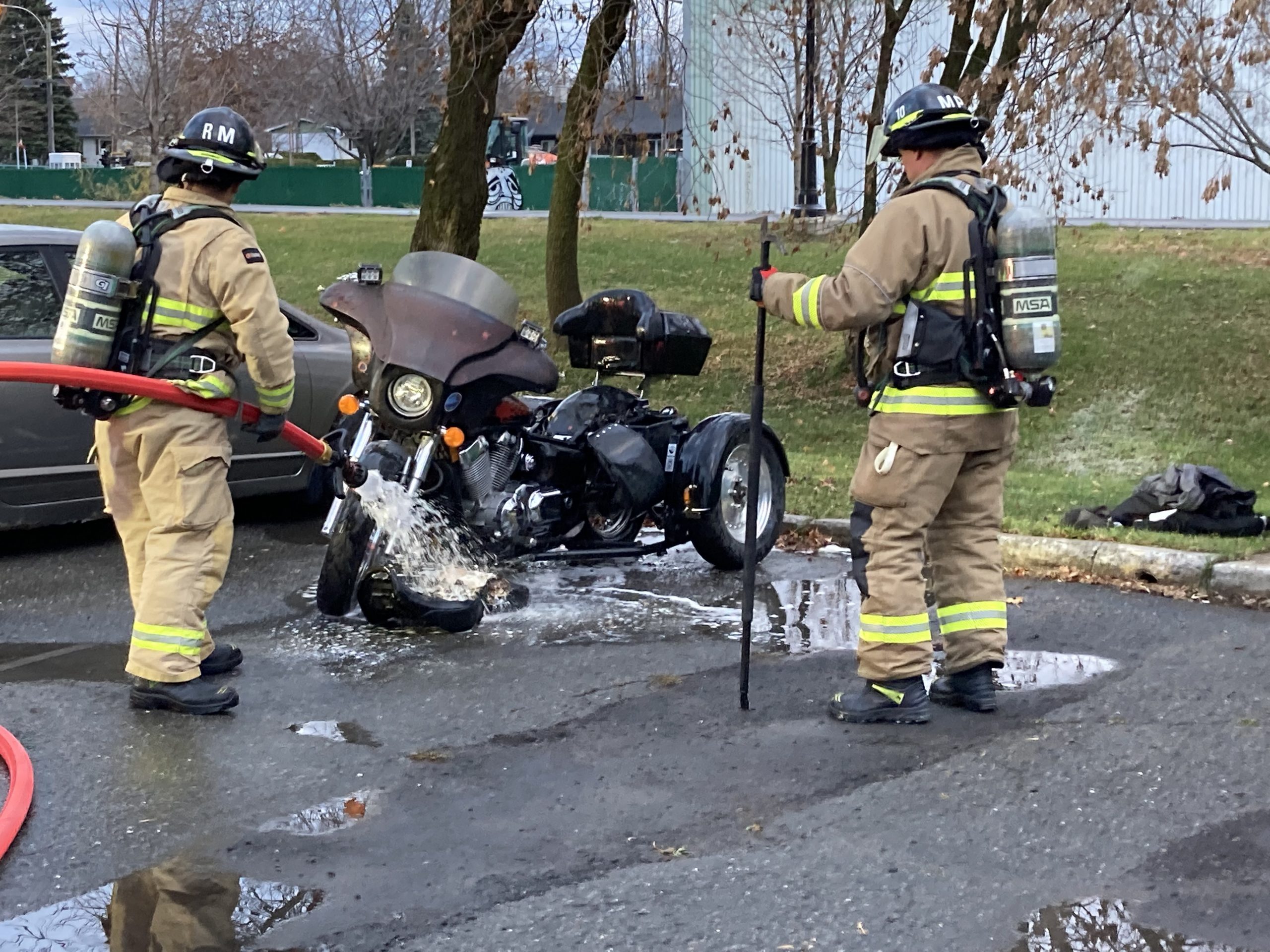 Une motocyclette à trois roues, garée dans le stationnement d’un immeuble à logements de la rue Milot tout près du Parc linéaire des Bois-Francs à Victoriaville a pris feu, jeudi après-midi, pour une raison encore indéterminée.