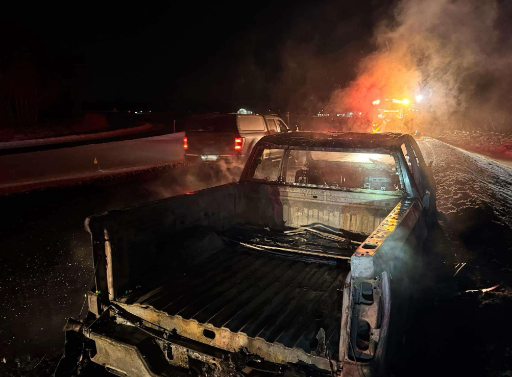 Une camionnette de l’année 2020 a été détruite par les flammes en fin de journée, jeudi, dans la bretelle de l’autoroute 20 ouest au kilomètre 228 à Saint-Louis-de-Blandford.