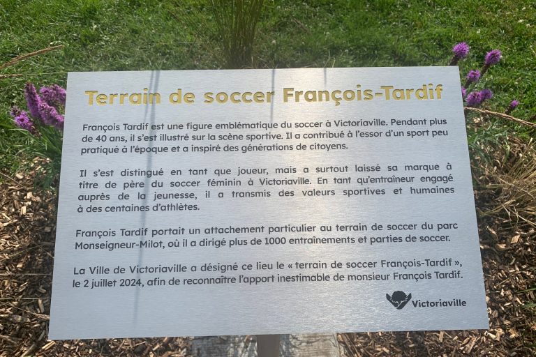 “François Tardif a certainement marqué l’histoire de Victoriaville et nous souhaitons souligner son apport exceptionnel. En tant qu’entraîneur de soccer, il a accompagné et dirigé de nombreux athlètes. Pendant plus de 40 ans, il s’est investi bénévolement sur la scène sportive victoriavilloise. Il s’est distingué comme joueur, mais il a surtout laissé sa marque en tant que père du soccer féminin à Victoriaville”, a énoncé Stéphanie Béland, agente de communication pour la Ville de Victoriaville.